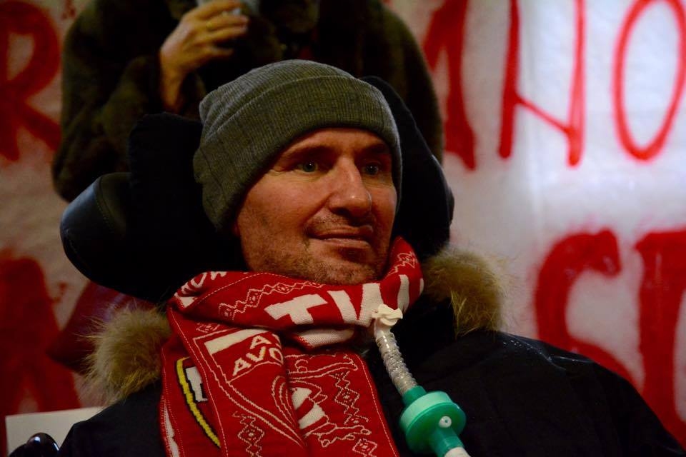 Da sei anni è imprigionato in una specie di sarcofago, respira con un macchinario rumoroso acceso ventiquattro ore su ventiquattro, può mangiare solo pappe colorcaccadigatto, ha una cannula piantata in gola che va cambiata ogni quaranta giorni con sofferenze indicibili, le braccia quasi inesistenti. Eppure a se stesso e alla sua compagna Aiste ha promesso che guarirà. L’ha promesso anche a me, nella nostra lunga chiacchierata via Facebook.
