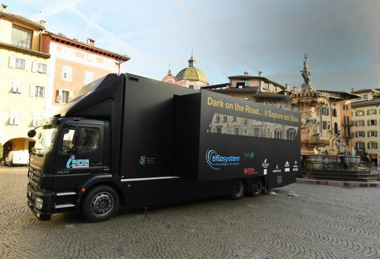 Nel 2013 era una maxiroulotte – racconta Ferdinando – trainata da una motrice, un mezzo unico, inaugurato con i calciatori e lo staff dell’Inter in ritiro estivo in Val Rendena. Negli anni successivi, il mezzo ha fatto il giro di alcune scuole trentine per il progetto di sensibilizzazione SensAzioni Positive ed è stato utilizzato per eventi e fiere. Dopo alcuni mesi ci siamo accorti che serviva un altro veicolo, con meno barriere. Ci siamo affidati a B&Amp B Car Srl, una ditta della provincia di Bologna, leader nel settore degli allestimenti speciali e siamo arrivati alla versione attuale di Dark on the Road, con soluzioni altamente tecnologiche e un design all’avanguardia. In questo senso, unico. Nel nostro bar, i clienti possono degustare al buio prodotti della cucina trentina e sono accompagnati da camerieri, da 4 a 6, ciechi e ipovedenti, retribuiti.